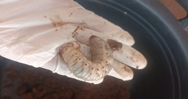 A : Larva Orytes Rhonoceros sehat, gerakan lincah dan pertumbuhan baik