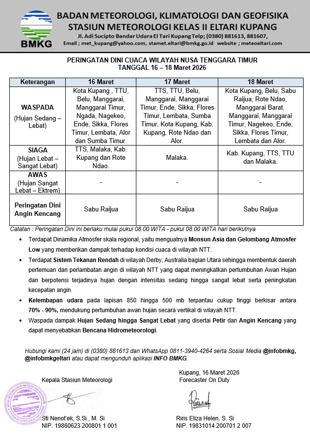 Badan Meteorologi, Klimatologi, dan Geofisika atau BMKG Stasiun Meteorologi Kelas II Eltari Kupang mengeluarkan peringatan dini cuaca untuk wilayah Nusa Tenggara Timur pada tanggal 16 sampai 18 Maret 2026. Informasi ini menunjukkan adanya potensi hujan dengan intensitas sedang hingga sangat lebat di sejumlah kabupaten dan kota, serta potensi angin kencang di wilayah tertentu. Peringatan ini berlaku mulai pukul 08.00 WITA hingga 08.00 WITA hari berikutnya.