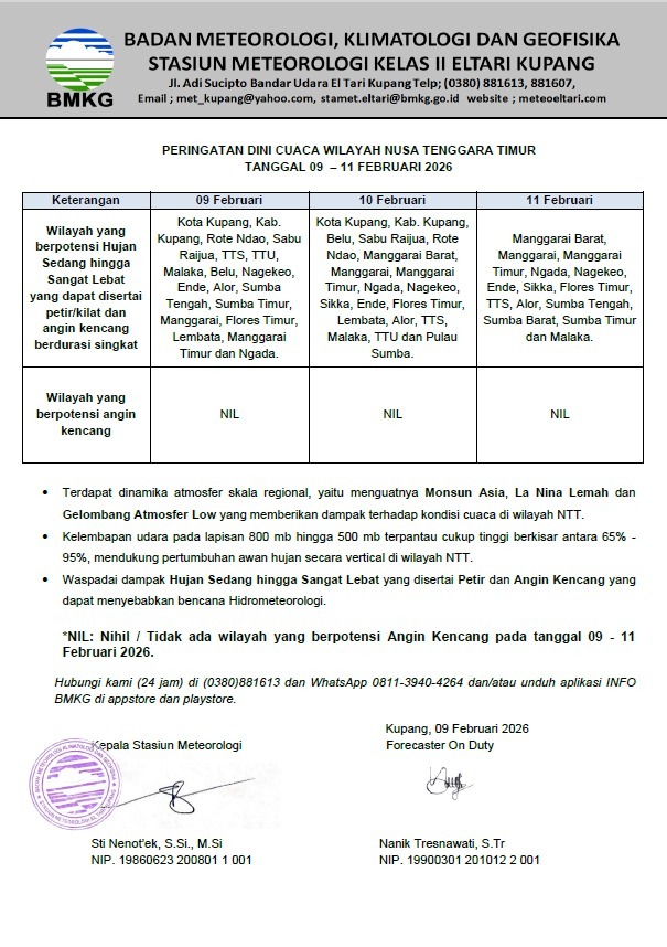 Badan Meteorologi, Klimatologi, dan Geofisika (BMKG) melalui Stasiun Meteorologi Kelas II El Tari Kupang mengeluarkan Peringatan Dini Cuaca Wilayah Nusa Tenggara Timur (NTT) yang berlaku pada 9–11 Februari 2026.