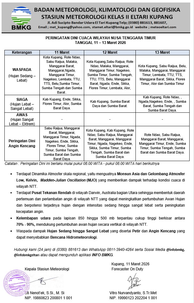 Badan Meteorologi, Klimatologi, dan Geofisika (BMKG) mengeluarkan peringatan dini cuaca untuk wilayah Nusa Tenggara Timur (NTT) yang berlaku pada 11 hingga 13 Maret 2026. Informasi ini disampaikan melalui Stasiun Meteorologi Kelas II El Tari Kupang sebagai langkah antisipasi terhadap potensi cuaca ekstrem di beberapa wilayah.