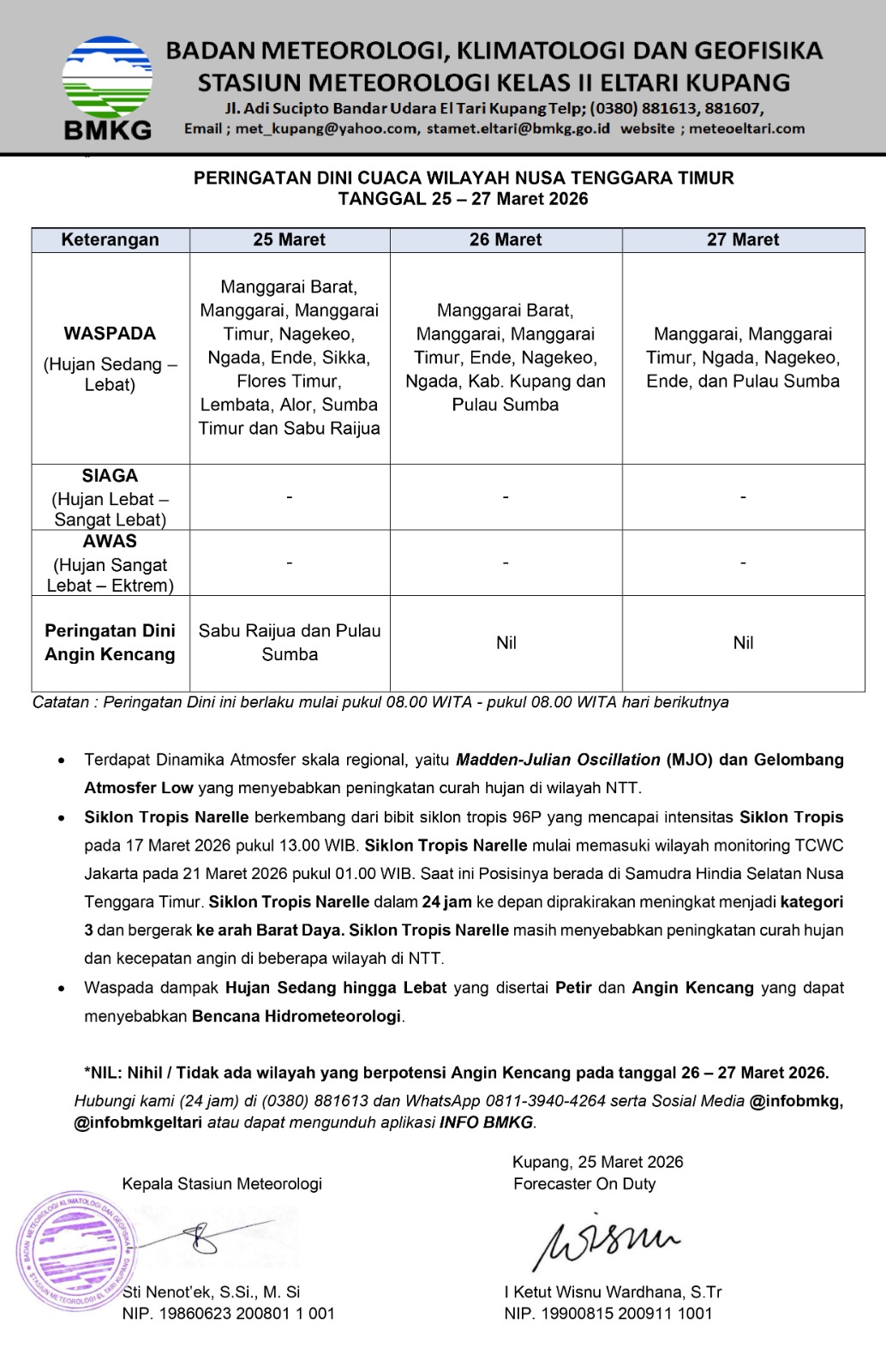 Peringatan Dini Cuaca Nusa Tenggara Timur Periode 25 sampai 27 Maret 2026