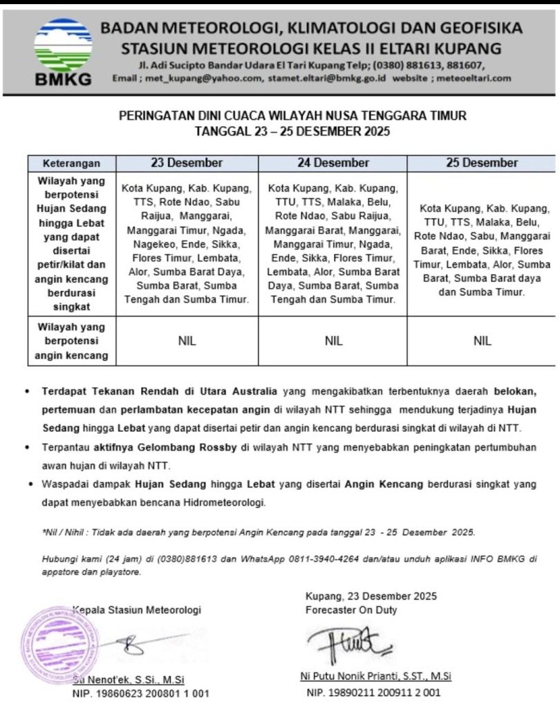 Berdasarkan informasi BMKG Stasiun Meteorologi Kelas II El Tari Kupang, wilayah Nusa Tenggara Timur berpotensi mengalami hujan sedang hingga lebat yang dapat disertai petir/kilat dan angin kencang berdurasi singkat pada 23–25 Desember 2025 di sejumlah kabupaten/kota. Kondisi ini berpotensi menimbulkan dampak hidrometeorologi seperti genangan, banjir, dan tanah longsor.