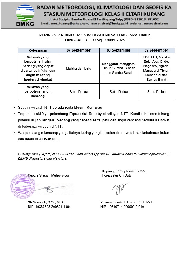 disertai petir/kilat dan angin kencang berdurasi singkat di Pulau Flores. Suhu udara berkisar
