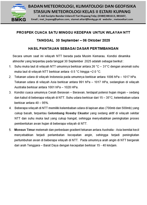Secara umum saat ini wilayah NTT berada pada Musim Kemarau, Pertumbuhan awan mulai menurun dan Angin Monsoon Timur aktif. Kondisi dinamika atmosfer yang terpantau pada tanggal 30 September 2025 adalah sebagai berikut :