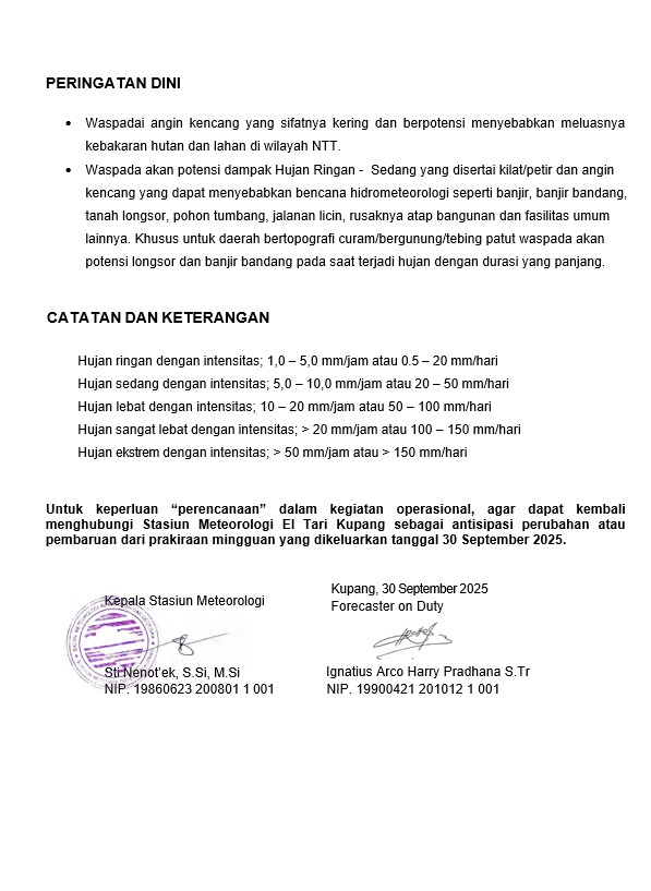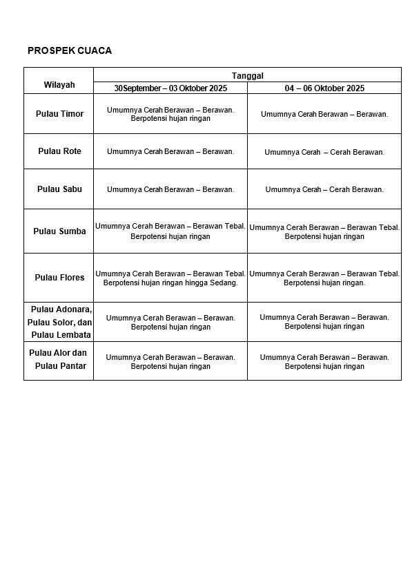 Prospek Cuaca Satu Minggu Kedepan Untuk Wilayah NTT Tanggal 30 September – 06 Oktober 2025